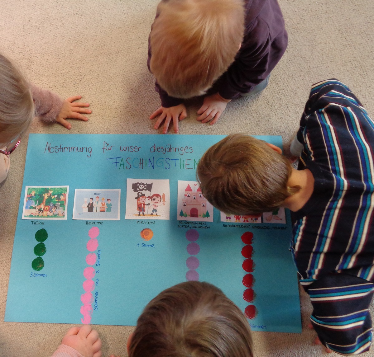 Die Kinder haben die Möglichkeit, ihren Alltag mitzubestimmen und mitzugestalten. Unser Bestreben ist es, immer mehr Projektarbeit zu praktizieren. Bei der Projektarbeit (Themen, die Kinder beschäftigen) wird ein Thema von verschiedenen Seiten beleuchtet, erforscht und erfahren. So erleben die Kinder die Welt in ihren Zusammenhängen, handeln selbstbestimmt, sind mutig und gewinnen Vertrauen in ihre eigenen Fähigkeiten. In der Kinderkonferenz stimmen die Kinder über Projektthemen und Alltagsthemen ab. Durch diese Mitbestimmung lernen sie: